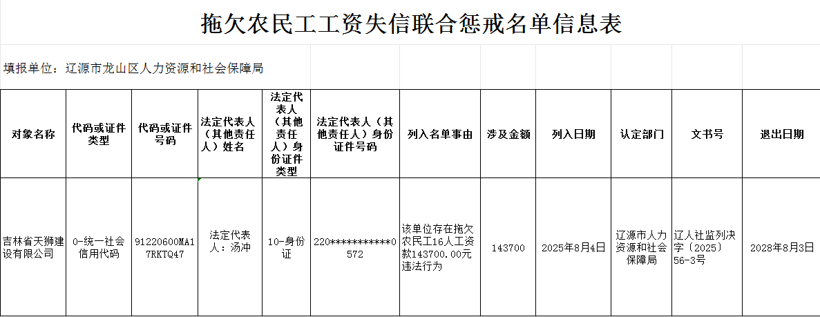 2025年8月拖欠农民工工资失信联合惩戒名单信息表