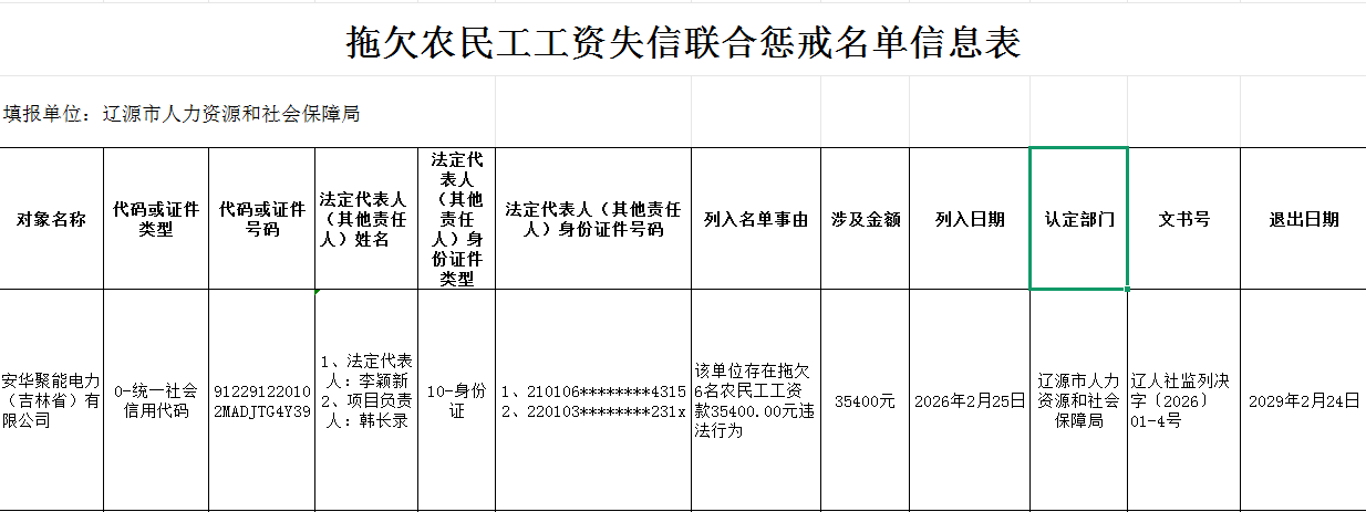 2026年2月拖欠农民工工资失信联合惩戒名单信息表